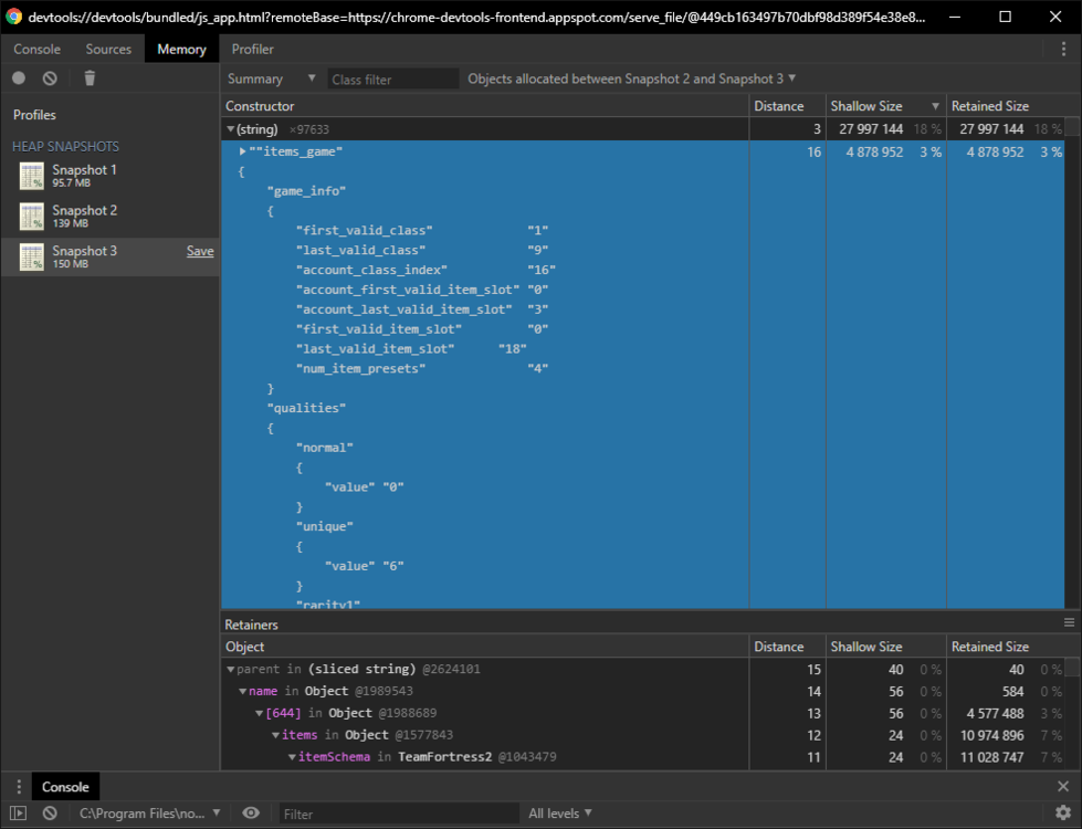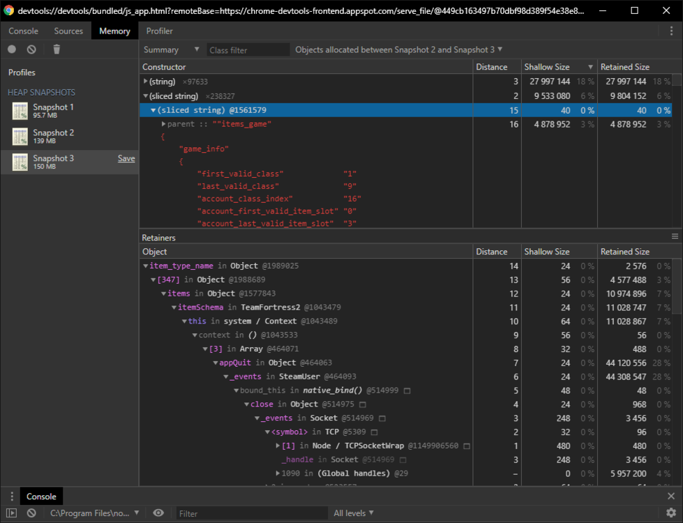 manager.on('receivedOfferChanged', function (offer) { if (offer.state === TradeOfferManager.ETradeOfferState.Accepted) { delete(tf2.backpack); tf2 = new TeamFortress2(client); client.gamesPlayed([440], true); } }); Didn't make any difference, I guess. I don't know how to properly catch memory leaks but I guess there's something to do with the lib itself. Snapshot 1 is taken while the bot is in idle state, TF2 client was initialized and then killed. (95MB) Snapshot 2 is taken after the bot has finished processing an offer and initialized a new tf2 client (deleted tf2.backpack before that), ran the currencyMaintainer, killed 440. (139MB) Snapshot 3 is the same cycle as snapshot 2. (150MB, ~11MB diff) -