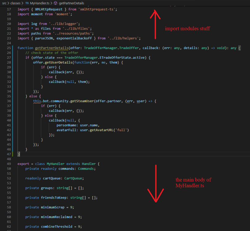 How to properly use getUserDetails functionIdiNium replied to IdiNium's topic in node-steam-tradeoffer-manager Thank you for the link on the tutorial/explanation about it. It's a good video than the others that I've watched. It's a good speed for a beginner like me to catch up with it. Well, back to the coding, TypeScript detects some problem from the function that you've shared to me and this is what I came back nicer: function getPartnerDetails(offer: TradeOfferManager.TradeOffer, callback: (err: any, details: any) => void): any { // I need to put arrow function there // check state of the offer if (offer.state === TradeOfferManager.ETradeOfferState.active) { offer.getUserDetails(function(err, me, them) { // It seems you missed this part. if (err) { callback(err, {}); } else { callback(null, them); } }); } else { this.bot.community.getSteamUser(offer.partner, (err, user) => { if (err) { callback(err, {}); } else { callback(null, { personName: user.name, avatarFull: user.getAvatarURL('full') }); } }); } } However, I am not really sure where I should put this function into. Currently, I put these lines of code between the import modules and the main body of the MyHandler.ts file. I've also tried do as you do for the sendWebhookTradeSummary, and it's all good there. However, there's an error at "this" on the function getPartnerDetails as shown below: And I am not so sure how to solve this issue. I've tried as shown below and import SteamCommunity from 'steamcommunity': Move hovering on the highlighted getSteamUser show it does not exist: Then I take a look into the ./src/types/modules/ and found a folder named steamcommunity, and when I open the index.d.ts file there, I can not found the getSteamUser function. Here is the content of the index.d.ts for steamcommunity module (this is the one that the developer made it himself right?): declare module 'steamcommunity' { import { EventEmitter } from 'events'; import SteamID from 'steamid'; import { CookieJar } from 'request'; interface Events { sessionExpired: () => void; confKeyNeeded: (tag: string, callback: (err?: Error, time?: number, confKey?: string) => void) => void; } class SteamCommunity extends EventEmitter { constructor(options?: object); steamID: SteamID | null; _jar: CookieJar; loggedIn(callback: Function): void; getSessionID(): string; getWebAPIKey(domain: string, callback: (err?: Error, key?: string) => void); setCookies(cookies: string[]): void; editProfile( settings: { name?: string; realName?: string; summary?: string; country?: string; state?: string; city?: string; customURL?: string; featuredBadge?: number; primaryGroup?: SteamID | string; }, callback?: (err?: Error) => void ): void; profileSettings( settings: { profile?: number; comments?: number; inventory?: number; inventoryGifts?: boolean; gameDetails?: number; playTime?: boolean; friendsList?: number; }, callback?: (err?: Error) => void ): void; uploadAvatar( image: Buffer | string /* , format?: string */, callback?: (err?: Error, url?: string) => void ): void; inviteUserToGroup(userID: SteamID | string, groupID: SteamID | string, callback?: (err?: Error) => void): void; getSteamGroup(id: SteamID | string, callback: (err?: Error, group?: SteamCommunity.Group) => void): void; getTradeURL(callback: (err?: Error, url?: string, token?: string) => void): void; acceptConfirmationForObject(identitySecret: string, objectID: string, callback: (err?: Error) => void): void; } namespace SteamCommunity { interface Group { steamID: SteamID; name: string; url: string; headline: string; summary: string; avatarHash: Buffer; members: number; membersInChat: number; membersInGame: number; membersOnline: number; join: (callback?: (err?: Error) => void) => void; } } export = SteamCommunity; } So I got confused on how to go for another steps. Btw I've pushed these changes to my git repo for tracking. (https://github.com/idinium96/tf2-automatic/tree/partner-avatar-and-name) Again, I am sorry for your time and effort and thank you so much.