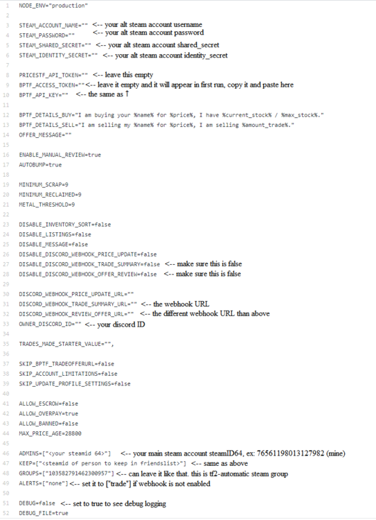 How to properly use getUserDetails functionIdiNium replied to IdiNium's topic in node-steam-tradeoffer-manager @vrtgn Sorry for the long late reply, yes there are two separate function that I am working on. The review offer is working just fine since the offer is still active, but not for when the trade is accepted. Sure, but I am not sure if here is the correct place to do this, but there you go. You can git clone the repo that I am working on, do navigate to where you want the tf2-automatic folder to be created first and run in terminal or cmd (I assume you have installed git and nodejs on your system): git clone https://github.com/idinium96/tf2-automatic.git && cd tf2-automatic && git checkout partner-avatar-and-name && npm install If you haven't yet install TypeScript, then install it globally: npm install typescript@latest -g and then compile the code (navigated to tf2-automatic folder): npm run build then you need to edit the template.env file and fill in the required variables. Note that you need to use Steam Desktop Authenticator (SDA) to extract the shared_secret and identity_secret of your alt steam account. It can be found inside maFiles folder inside SDA main folder. For getting the webhook URL, first make sure you have created your own Discord server and create a channel. Click on the channel and click Edit Channel (⚙), and click on Webhooks. Click Create Webhook and copy the Webhook URL there and paste it the env. You can have separate webhook for accepted trade summary and for review offer (create another one and copy and paste the link). For your discord ID, make sure you've enabled Developer mode in your Discord settings, then right click on yourself and click copy ID and paste it there. This is just to make the webhook ping (mentioned) you when there's an offer to be reviewed. After you've completed filled in the required variables, save the template.env as only .env (only the extension without any name). Then to run the bot, run node dist/app.js Then to test to see if the sendWebHookReviewOfferSummary and sendWebHookTradeSummary is working or not, first make sure you send some items to the bot (the bot will accept any trade from ADMINS) so that an exchange of item can be done. Then, since you're still not added any item to the bot's price list, then any offer that you send using another alt account (or with the help of your friend) to the bot will triggered an offer to be reviewed. This will be sent to the webhook you've set. Then, to see if sendWebHookTradeSummary (that is currently not working), copy the trade number or and offerId (in bracket) and send "!accepttrade <offerId>" to the bot via steam chat. Then if you see the log it will show the value for both avatarFull and personaName are undefined. Oh ya, I have not realised that. Thank you for noticing it. I am not sure by what you mean by this. Btw, thank you very much and feel free to ask if you got any problem running the bot. You may also read more about it here (but the original one does not include the Discord Webhook Integration): https://github.com/Nicklason/tf2-automatic