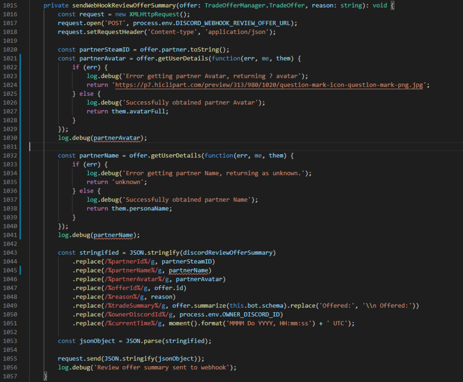 How to properly use getUserDetails functionIdiNium replied to IdiNium's topic in node-steam-tradeoffer-manager Hello @vrtgn, Thank you for your time and effort explaining to me how it should be working and etc! I really don't know that a variable is not assignable to a function. At first I thought the function will return as a value to the variable, but in reality it's not. I'll keep that in mind and learn more about this. About the code you've shared to me, it's working with some small replacement made and yes, it really is working! Here's the one that is working: private sendWebHookReviewOfferSummary(offer: TradeOfferManager.TradeOffer, reason: string): void { const request = new XMLHttpRequest(); request.open('POST', process.env.DISCORD_WEBHOOK_REVIEW_OFFER_URL); request.setRequestHeader('Content-type', 'application/json'); const partnerSteamID = offer.partner.toString(); const tradeSummary = offer.summarize(this.bot.schema); // I replace this to here, because "this" will be undefined if placed as before let partnerAvatar; // I declare variables before the function let partnerName; log.debug('getting partner Avatar and Name...'); offer.getUserDetails(function(err, me, them) { if (err) { partnerAvatar = 'https://p7.hiclipart.com/preview/313/980/1020/question-mark-icon-question-mark-png.jpg'; // Giving it "?" image. partnerName = 'unknown'; // Set it to unknown } else { partnerAvatar = them.avatarFull; partnerName = them.personaName; } const stringified = JSON.stringify(discordReviewOfferSummary) .replace(/%partnerId%/g, partnerSteamID) .replace(/%partnerName%/g, partnerName) .replace(/%partnerAvatar%/g, partnerAvatar) .replace(/%offerId%/g, offer.id) .replace(/%reason%/g, reason) .replace(/%tradeSummary%/g, tradeSummary.replace('Offered:', '\\n Offered:')) .replace(/%ownerDiscordId%/g, process.env.OWNER_DISCORD_ID) .replace(/%currentTime%/g, moment().format('MMMM Do YYYY, HH:mm:ss') + ' UTC'); const jsonObject = JSON.parse(stringified); request.send(JSON.stringify(jsonObject)); }); log.debug('Review offer summary sent to webhook'); } But, then, when I try to accept the trade, and this function should be called when it accept the trade: private sendWebHookTradeSummary(offer: TradeOfferManager.TradeOffer): void { const request = new XMLHttpRequest(); request.open('POST', process.env.DISCORD_WEBHOOK_TRADE_SUMMARY_URL); request.setRequestHeader('Content-type', 'application/json'); const partnerSteamID = offer.partner.toString(); const tradeSummary = offer.summarize(this.bot.schema); let tradesTotal = 0; const offerData = this.bot.manager.pollData.offerData; for (const offerID in offerData) { if (!Object.prototype.hasOwnProperty.call(offerData, offerID)) { continue; } if (offerData[offerID].handledByUs === true && offerData[offerID].isAccepted === true) { // Sucessful trades handled by the bot tradesTotal++; } } const tradesMade = process.env.TRADES_MADE_STARTER_VALUE ? +process.env.TRADES_MADE_STARTER_VALUE + tradesTotal : 0 + tradesTotal; let partnerAvatar; let partnerName; log.debug('getting partner Avatar and Name...'); offer.getUserDetails(function(err, me, them) { if (err) { log.debug('Error retrieving partner Avatar and Name: ', err); partnerAvatar = 'https://p7.hiclipart.com/preview/313/980/1020/question-mark-icon-question-mark-png.jpg'; partnerName = 'unknown'; } else { log.debug('partner Avatar and Name retrieved. Applying...'); partnerAvatar = them.avatarFull; partnerName = them.personaName; } const stringified = JSON.stringify(discordTradeSummary) .replace(/%partnerId%/g, partnerSteamID) .replace(/%partnerName%/g, partnerName) .replace(/%partnerAvatar%/g, partnerAvatar) .replace(/%offerId%/g, offer.id) .replace(/%tradeNum%/g, tradesMade.toString()) .replace(/%tradeSummary%/g, tradeSummary.replace('Offered:', '\\n Offered:')) .replace(/%currentTime%/g, moment().format('MMMM Do YYYY, HH:mm:ss') + ' UTC'); const jsonObject = JSON.parse(stringified); request.send(JSON.stringify(jsonObject)); }); log.debug('Accepted trade summmary sent to webhook'); } Which I believe it shouldn't have any problem, because it's almost identical to the sendWebhookReviewOfferSummary, but on the Discord I've always received this: And when I check on the log, this is the error that it thrown: Is that mean I have to use another function to get partnerAvatar and partnerName from the trade that has been already been accepted? Again, thank you and I really appreciate your help!