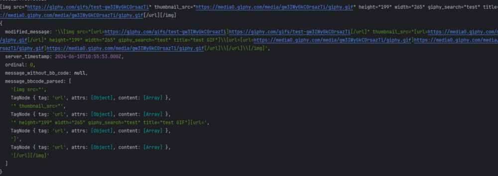 const messageTest = '[img src="https://giphy.com/gifs/test-gw3IWyGkC0rsazTi" thumbnail_src="https://media0.giphy.com/media/gw3IWyGkC0rsazTi/giphy.gif" height="199" width="265" giphy_search="test" title="test GIF"][url=https://media0.giphy.com/media/gw3IWyGkC0rsazTi/giphy.gif]https://media0.giphy.com/media/gw3IWyGkC0rsazTi/giphy.gif[/url][/img]';
