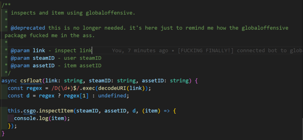 Hi guys. Just wanted to share my frustration with the globaloffensive package. How hard it was to connect to the game client, taking me over 4 weeks of part time development and in the end, reading the source code for csfloat/inspect to make it work! for it to no longer be needed (we are running csfloat in docker directly now) P.S: Jokes aside, thanks a lot doc. the packages are amazing, ALL of them. Wishing you the best ❤️
